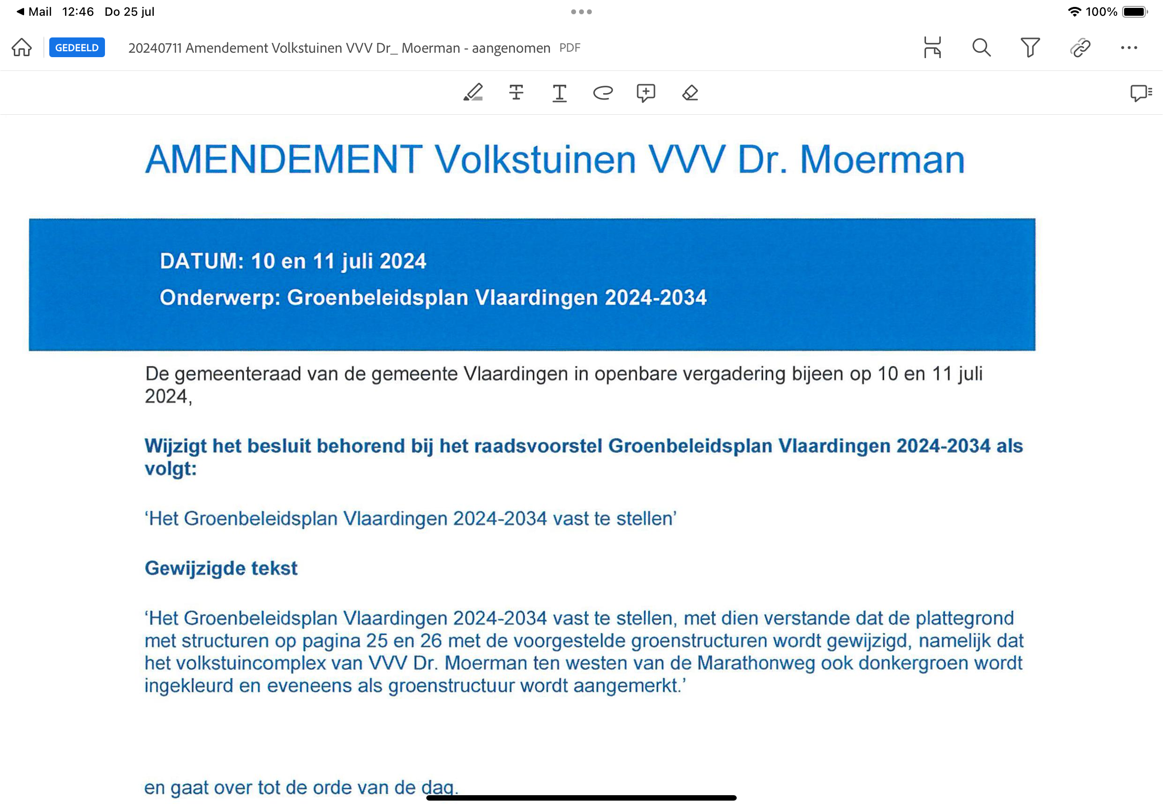 De volkstuinen aan de linkerkant van de Marathonweg waren niet meegenomen als hoofdgroenstructuur. Hiervoor is er een amendement ingediend en deze is aangenomen. De hoofdgroenstructurenkaart is aangepast en nu zijn de volkstuinen aan de linkerkant van de Marathonweg ook een onderdeel van de hoofdgroenstructuur in Vlaardingen. Dit figuur is opgenomen in de definitieve versie van de Groenvisie Vlaardingen 2024-2034.