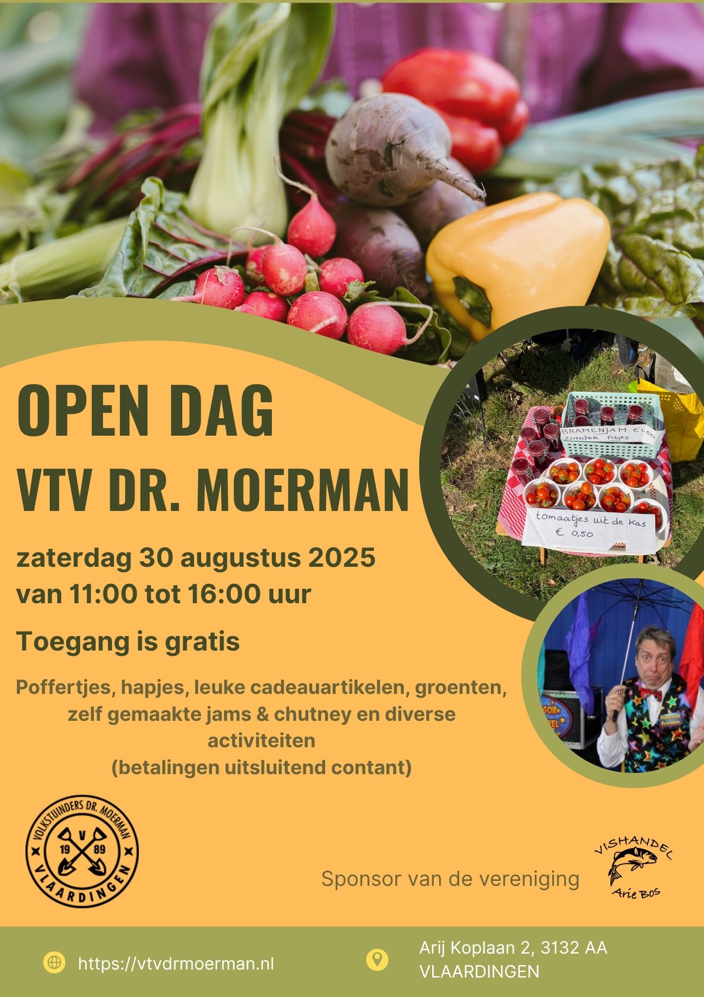 Om het groeiseizoen ook dit jaar weer feestelijk af te sluiten, organiseert de Vereniging van Volkstuinders Dr. Moerman op 30 augustus een open dag met oogstmarkt en (lokaal) lekkers. Iedereen is welkom aan de Arij Koplaan 2 om tussen 11.00 en 16.00 uur rond te neuzen tussen de tuinen. Voor de jongste bezoekers staat Professor Roodsnavel klaar met een legendarische goochelshow. Op de markt vindt u onder meer verse groenten, jam, heerlijke baksels, hete pepersaus en handgemaakte cadeauartikelen. En laat uw lunchtrommeltje maar thuis, want er is genoeg eten! Toegang is gratis en met uw aankopen draagt u bij aan de toekomst van de vereniging.