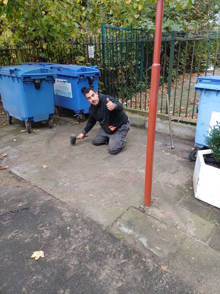 Het pad rondom de karton containers is weer glad bestraat.